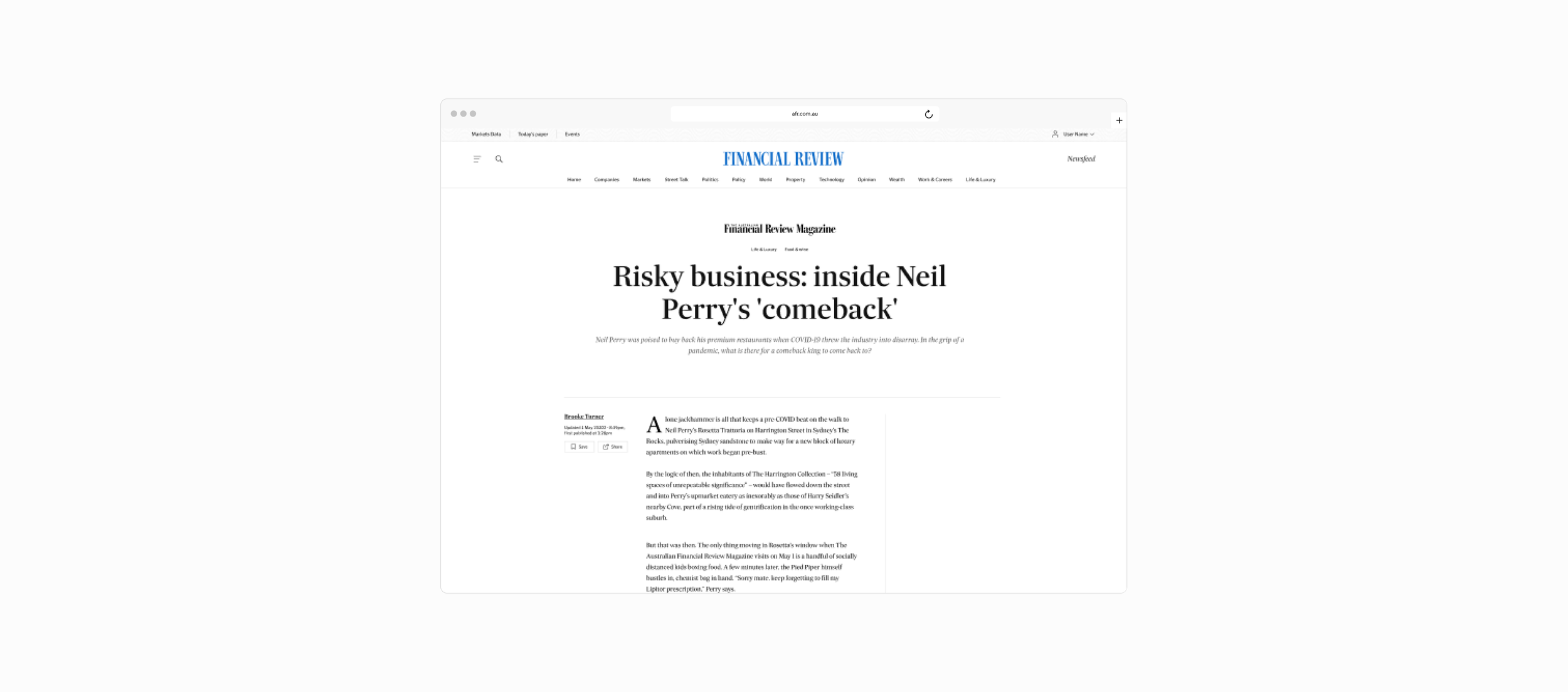 With a history of over representation of senior Caucasian males and generic imagery on The Australian Financial Review, we asked ourselves, how could we create a template that balanced different types of content — from candid lunch interviews with the best and brightest, through to investigative deep dive journalism. A template that didn’t force the hand of editorial to highlight meaningless imagery when better wasn’t available and could set the right tone to deliver an immersive story, no matter the context.